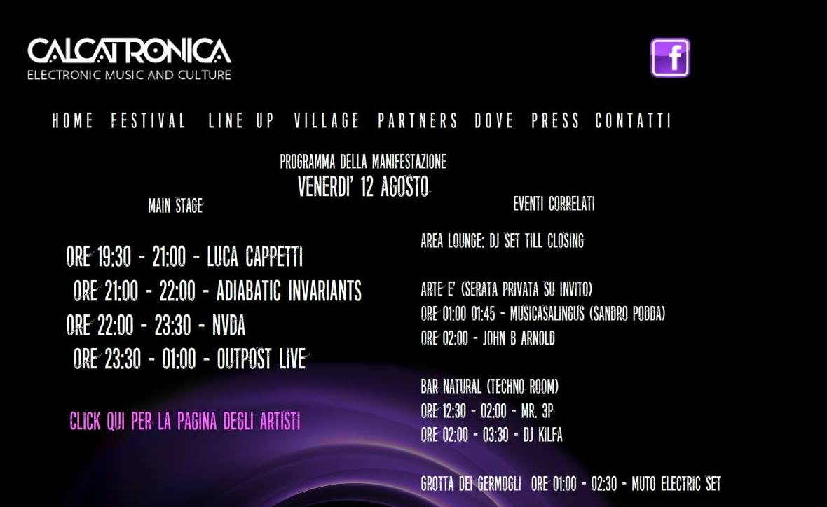 Organizzato da John B. Arnold in collaborazione con Wired Society, Etruria Turbosound, Natural e Il Granarone, Calcatronica potrà contare sulla presenza di tolebham, outpost, arz & blavatsky, nvda, space invaders, kinoglaz, lo stesso john b. arnold, kobalt, un:code, kilfa, maxim, mr.3p, ds step, julian frank, adiabatic invariants, iceone, d’arcangleo, h501l, wavescut, genny.s, marco micheli, alessandra bossa, tau ceti & marco ciccotti, sem si mone travis e musicalingus.